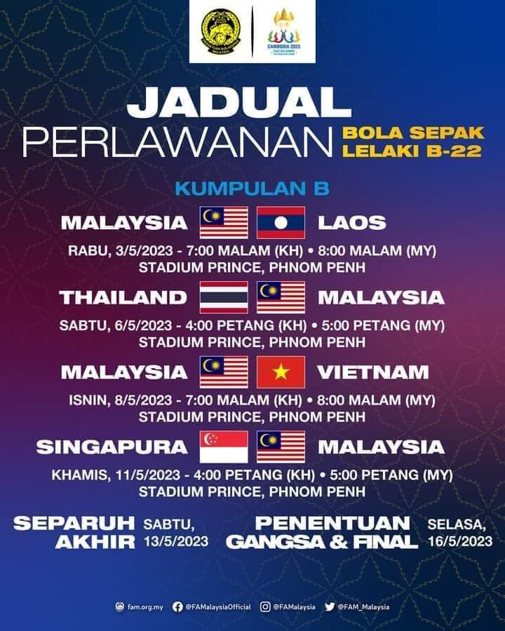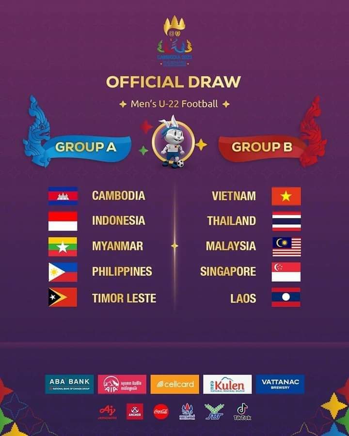Jadual Perlawanan Bola Sepak Sukan SEA 2023 Malaysia. Keputusan undian bolasepak Sukan SEA 2023 di Phnom Penh, Cambodia? Skuad B-23 kebangsaan kendalian Brad Maloney telah diundi dalam Kumpulan B bersama Thailand, Laos, Vietnam dan Singapura bagi Sukan SEA 2023 di Phnom Penh, 29 April hingga 16 Mei 2023. Sementara kumpulan A pula terdiri daripada Cambodia, Myanmar, Filipina, Indonesia dan Timor-Leste.